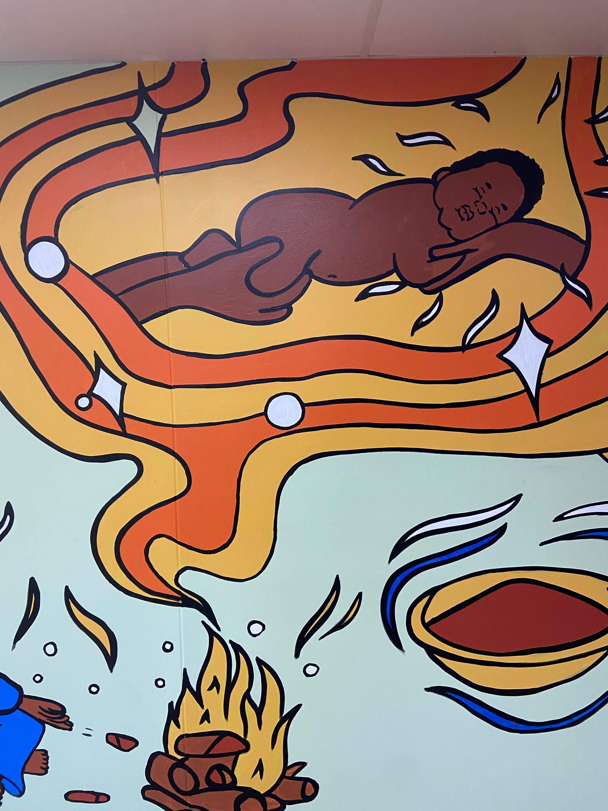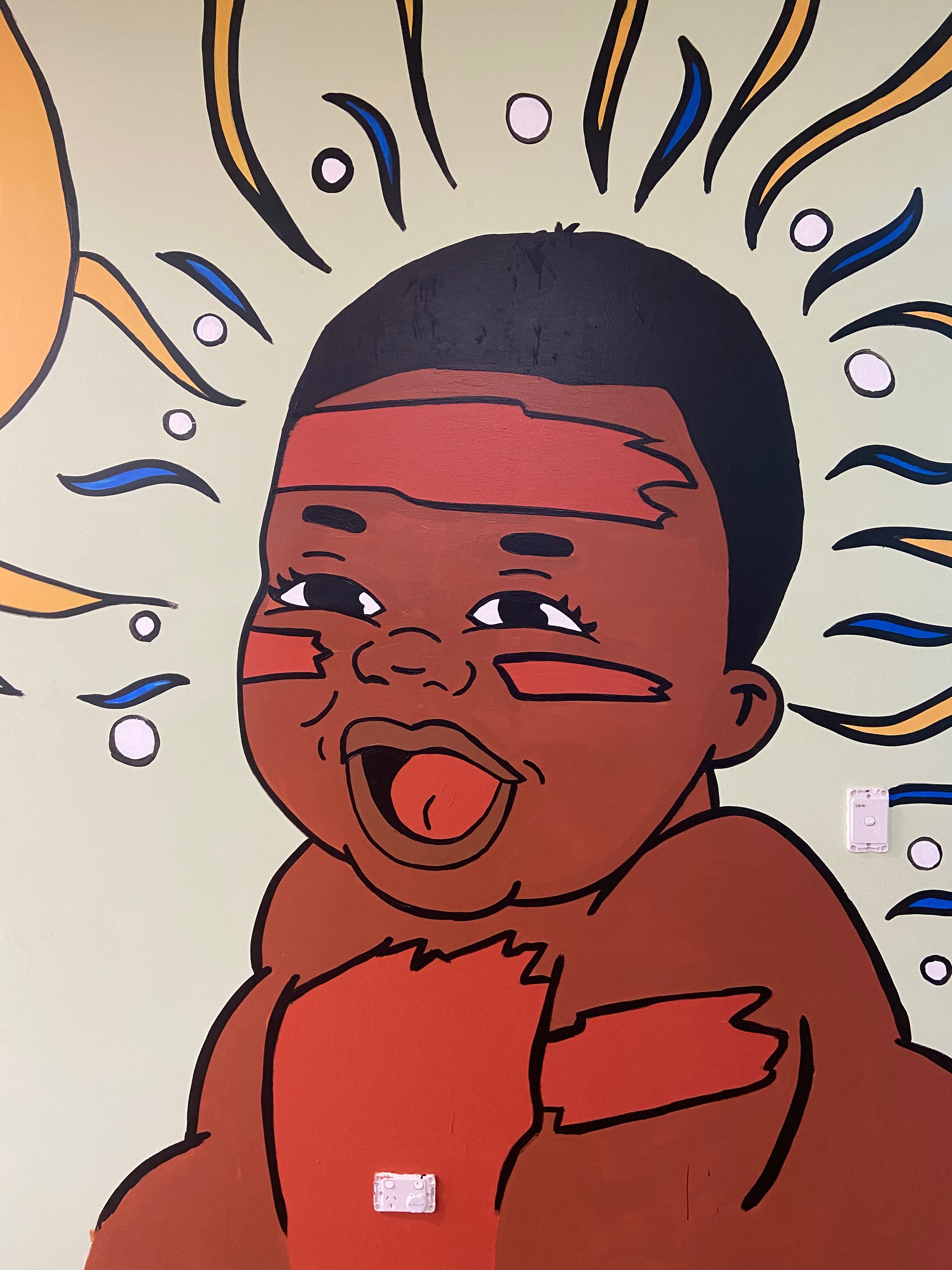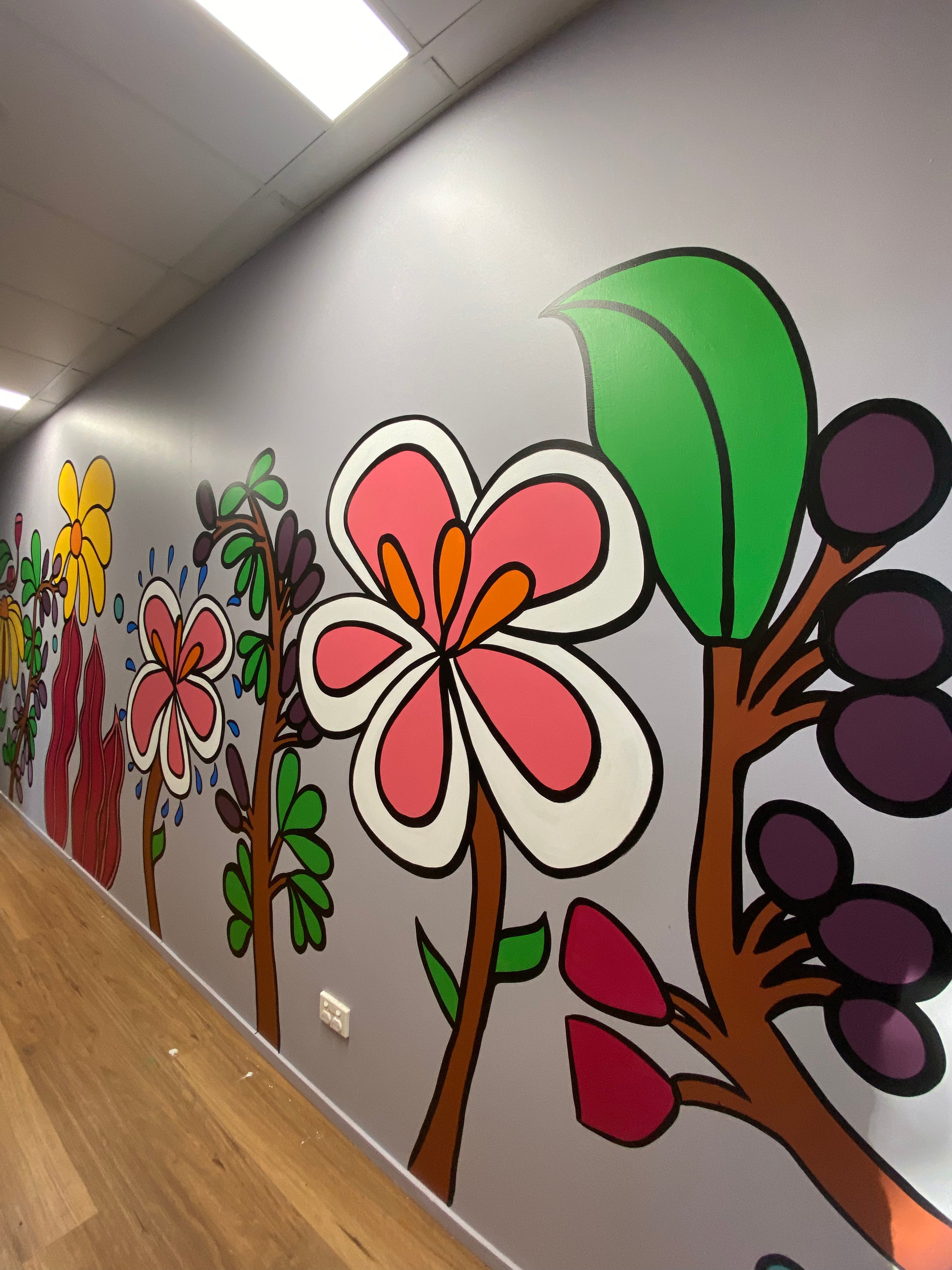 The family hub centre wanted to bring life and colour to their freshly painted blank walls. I got sit down with the women on the first day to discuss the family culture in the community and we decided to tell the story of the baby dreaming. A beautiful ceremony and tradition that happens when babies are born. To make them strong and healthy.