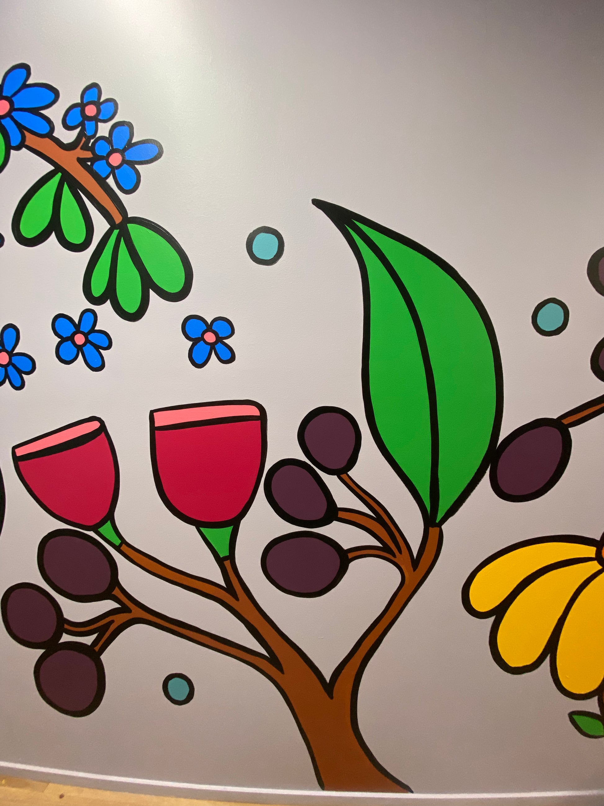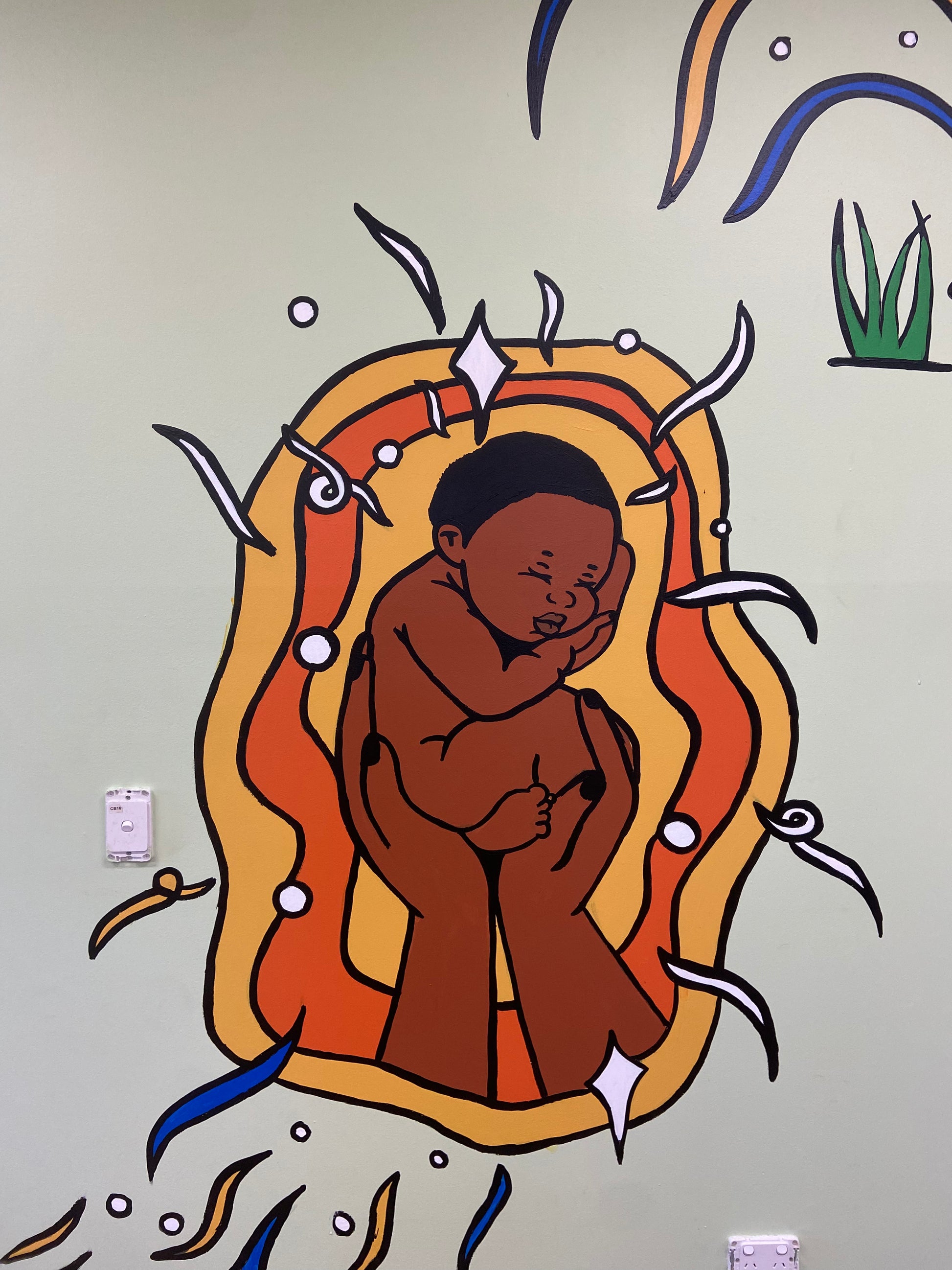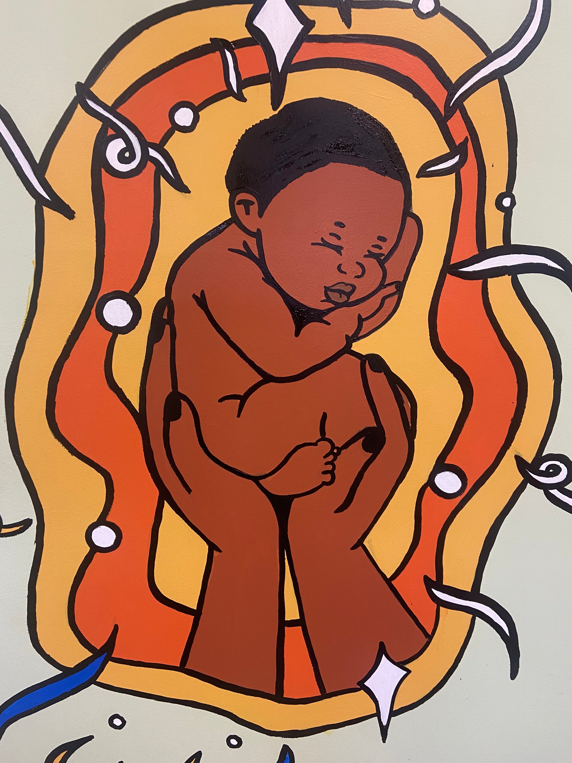 The family hub centre wanted to bring life and colour to their freshly painted blank walls. I got sit down with the women on the first day to discuss the family culture in the community and we decided to tell the story of the baby dreaming. A beautiful ceremony and tradition that happens when babies are born. To make them strong and healthy.
